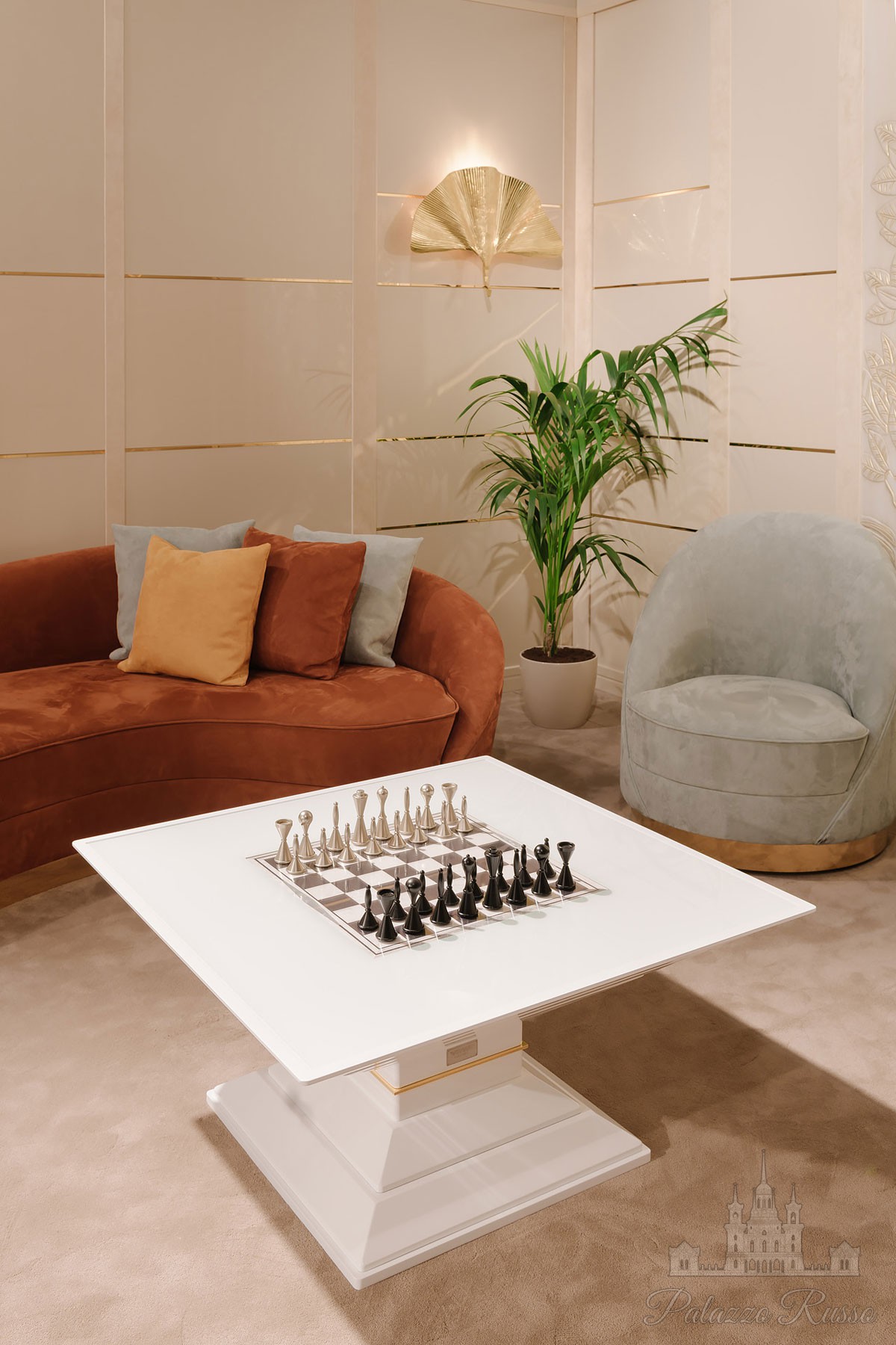 Дизайн: Современный стиль и соблазнительные формы — характеристики, проступающие в каждой детали этого шахматного стола. Этот стол — настоящее произведение искусства; к тому же, его можно использовать для различных целей. Подъемный механизм работает от литиевого аккумулятора, который можно зарядить от сети, и приходит в движение при нажатии кнопки на корпусе, или же при помощи пульта. Во внутренней части располагаются фигуры для игры в шахматы, шашки и короткие нарды. Шахматная доска инкрустирована эбеновым деревом и жемчугом и покрыта закаленным стеклом. Шахматные фигуры изготовлены из анодированного алюминия по рисункам дизайнеров Vismara и представляют собой редчайшие в своем роде экземпляры. По запросу можно дополнительно изготовить элегантную многофункциональную доску для игры в нарды. Неповторимость этого роскошного изделия состоит именно в его многофункциональности, которая позволяет использовать его как обычный журнальный столик или же как профессиональное игровое поле.
