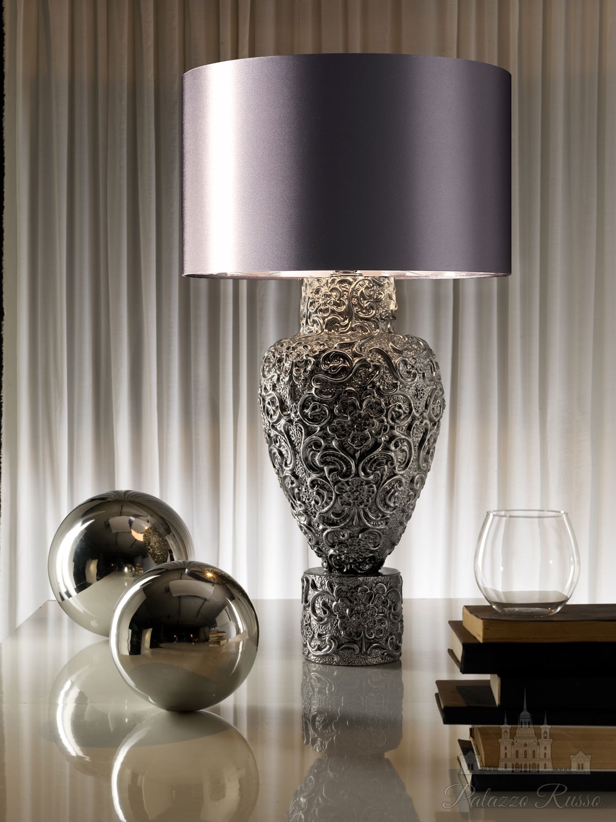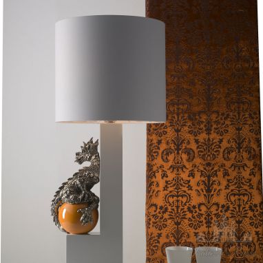 | Состав: | Лампа в ручной гравировке майолика, покрытая античной платиной, абажур в сером шелковом сатине |