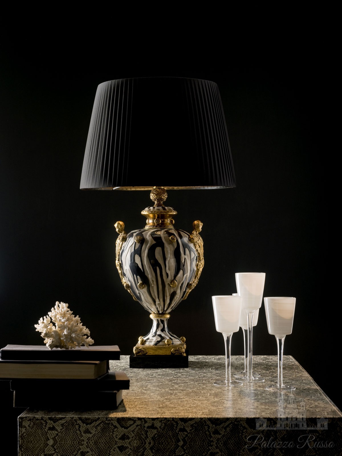 | Состав: | Лампа из майолики, расписанная вручную и покрытая золотом. Основание из глянцевого черного лакированного дерева. Абажур- plisse nero |