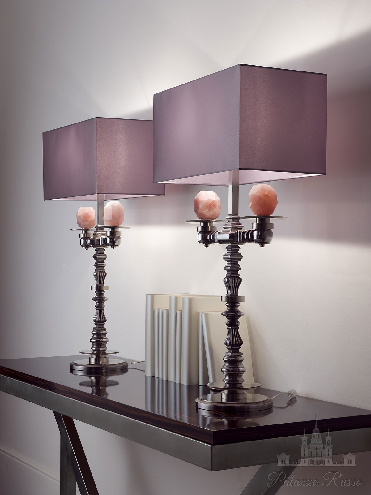 | Состав: | Лампа из латуни и железа, матовый хром. Камни в розовом кварце. Серый абажур из шелкового атласа |