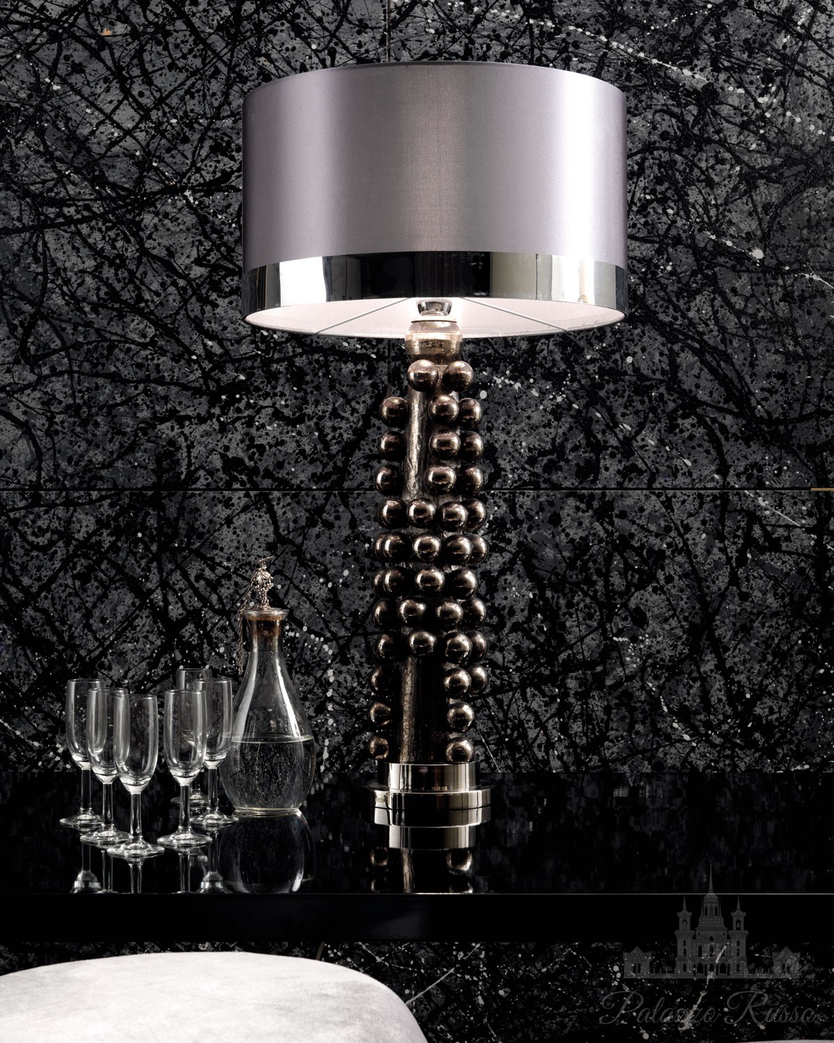 | Состав: | Лампа со стержнем полностью выгравирована из майолики, покрыта платиной. Основание и детали из хромированной латуни. Абажур из серого шелкового атласа и серебряной ленты |