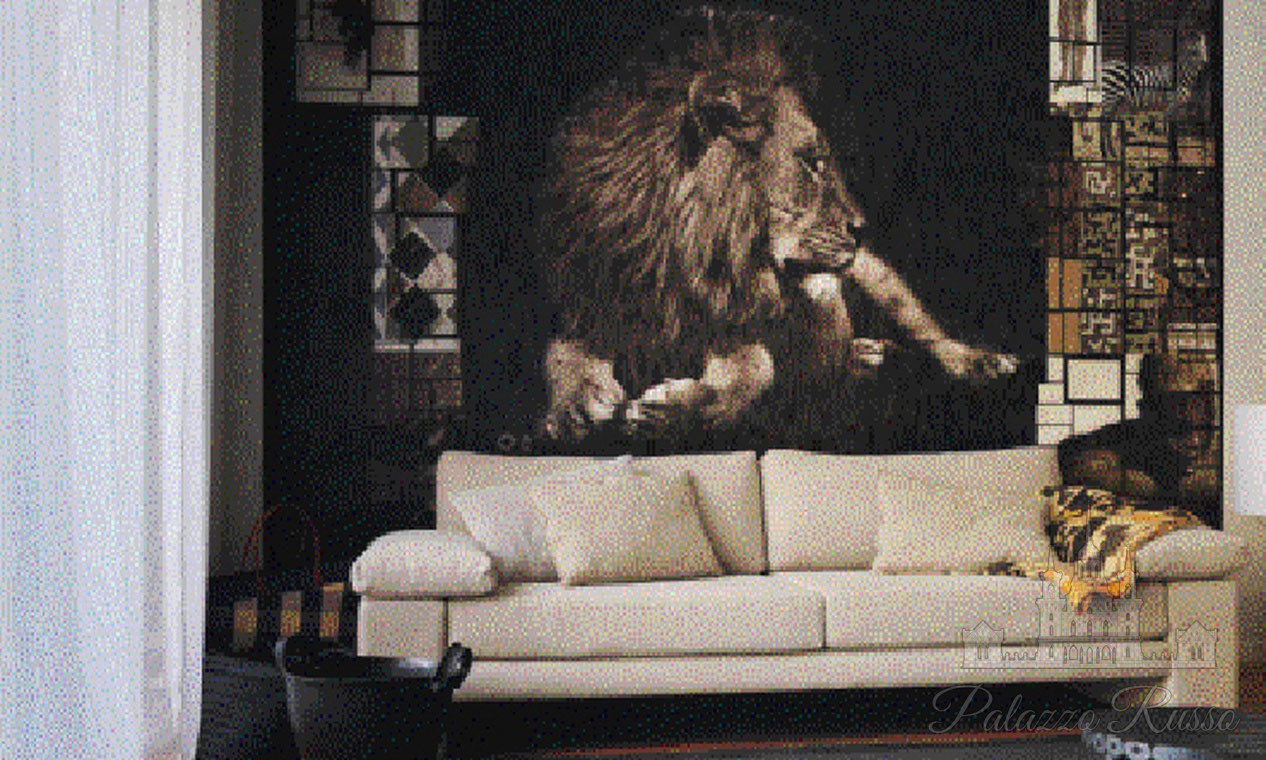 | Дизайн: | Внушительный портрет царя зверей с панорамным декором на обоях «под дерево» ( полотно из 5 панелей) |