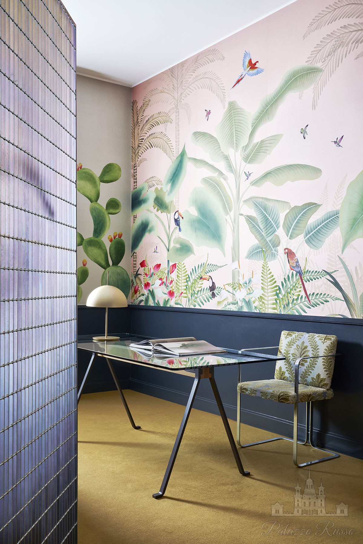 | Дизайн: | Декор воссоздает экзотический сад фантазий с большими банановыми листьями, пальмами, туканами, колибри и разноцветными попугаями. |