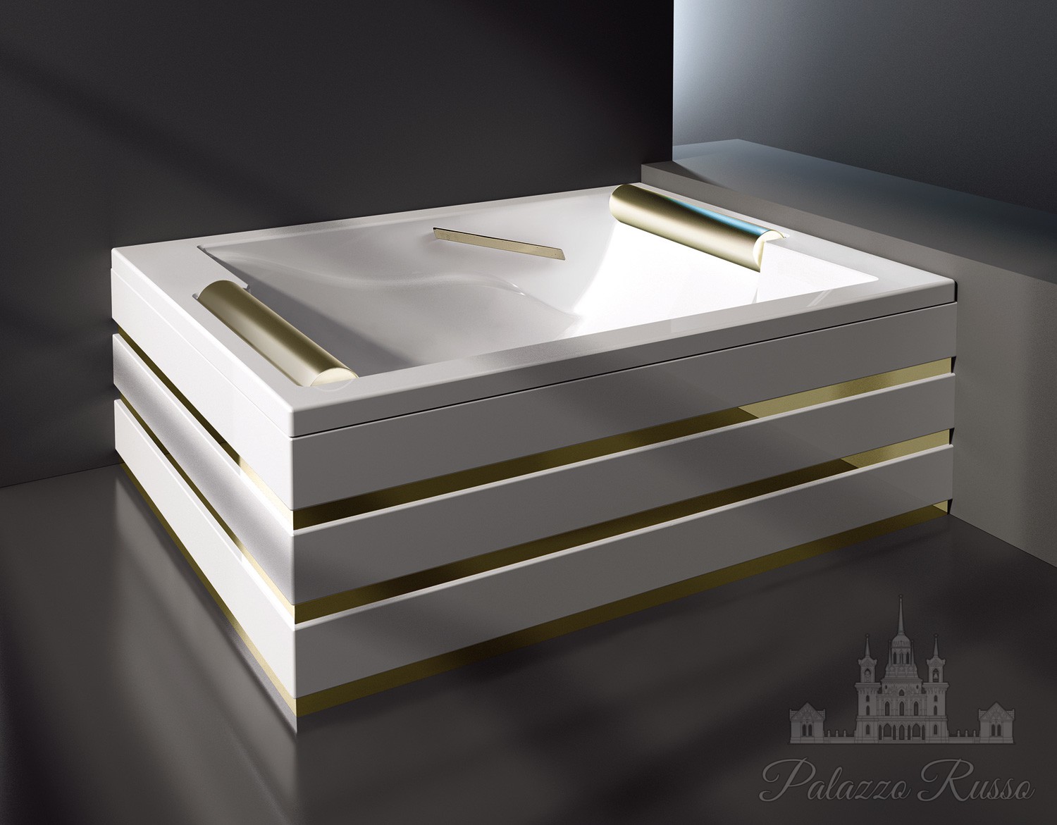 Дизайн: Подушки-подголовники опорные ручки гидромассаж аэромассаж датчик уровня система дезинфекции стабилизатор температуры воды хромотерапия лампа радио аудиовход для ipod/cd озонотерапия краны на бортике ванны пульт дистанционного управления функциями внешняя панель с отделкой из стали глянец/золото