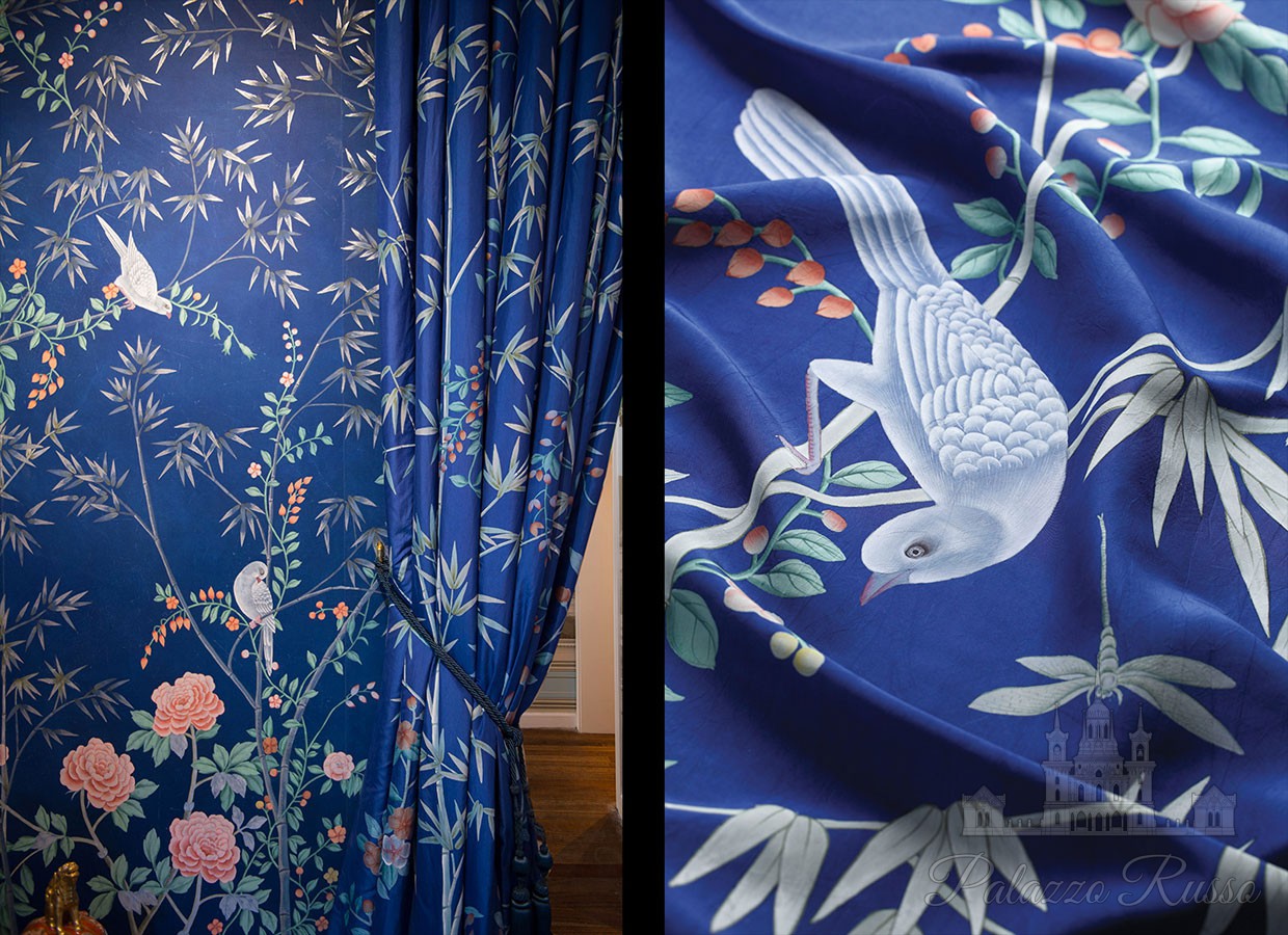 | Дизайн: | Дизайн 'portman' в стандартной цветовой гамме на синей шелковой тафте с эффектом состаривания |