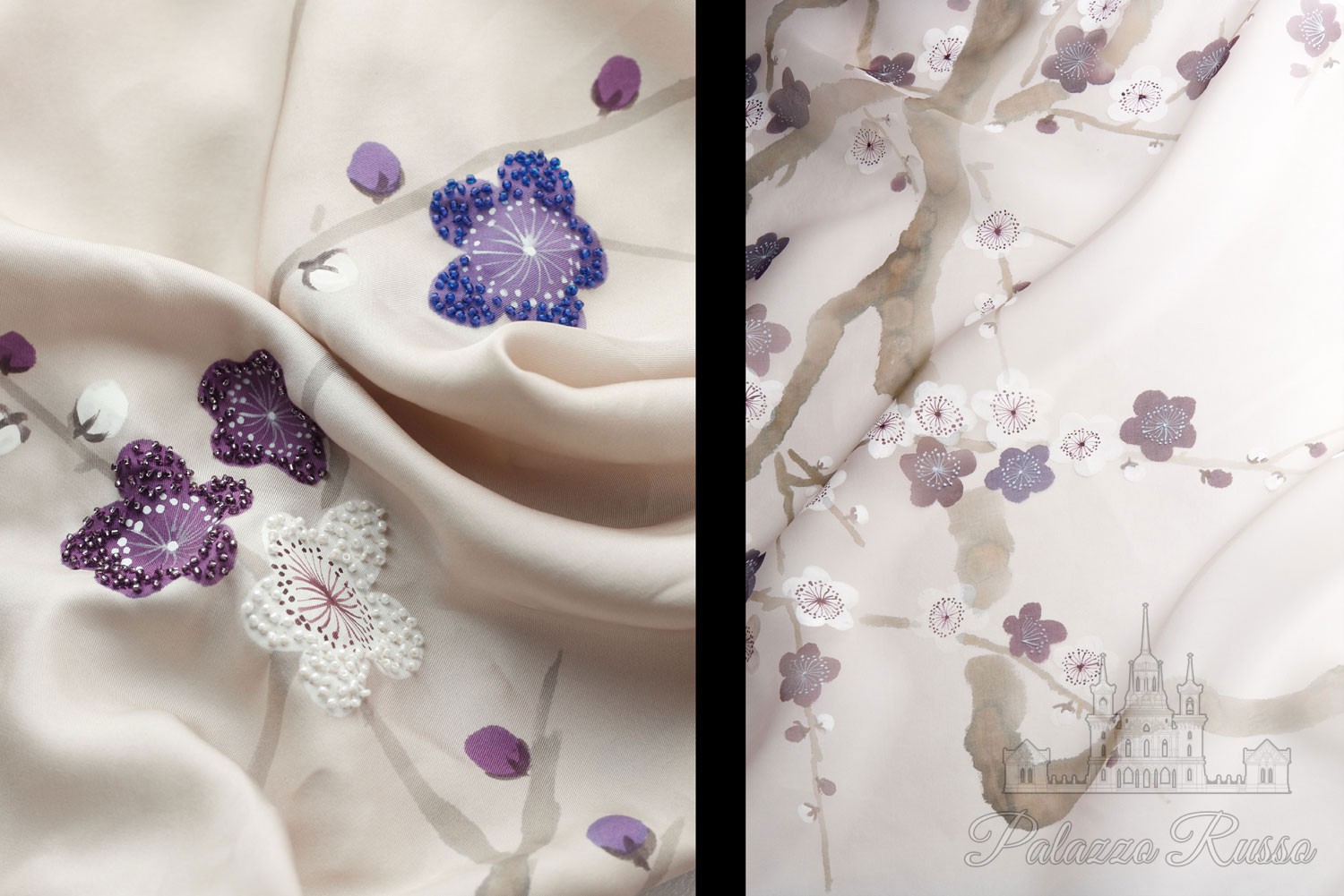 | Дизайн: | Дизайн ‘plum blossom’ в цветовой палитре lavender, цвет cotswold stone с вышивкой бисером на заказ/ дизайн ‘plum blossom’ в цветовой палитре lavender, цвет almost mauve. |