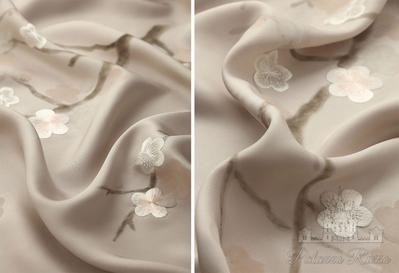 | Дизайн: | Дизайн 'plum blossom' в нестандартной цветовой гамме с вышивкой на шелковом твиле цвета orchid tint |