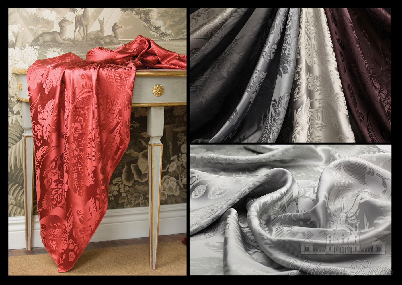 Коллекция шелковых дамасков. цвета: scarlet lady, wood ash, mercury, gun metal, bleached silver.